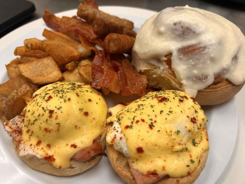 Sweet Potato Hash w/ Cheddar Hollandaise, Cobb Smoked Bacon, Baked Breakfast Avocado, Black Cherry Chocolate Bread Pudding